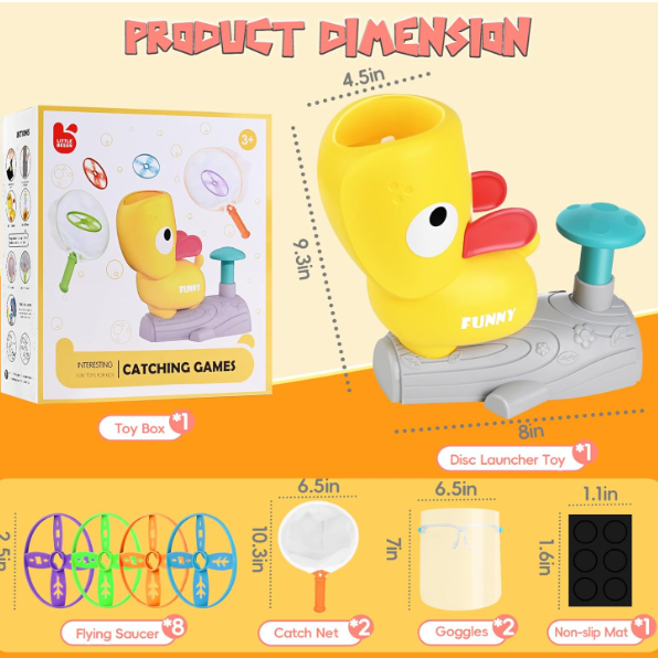Answer 1: This Outdoor Stomp Flying Disc Launcher features a cute elephant design and can launch up to 4 colorful flying discs at a range of 45 feet, making it engaging and fun for kids aged 3 to 10.